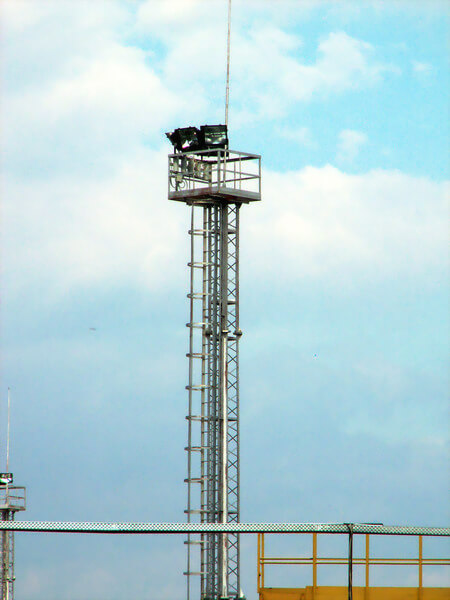 Верхняя часть прожекторной мачты состоит из специальной площадки для смотровых и ремонтных робот, а далее – из нескольких рядов светильников/осветительных установок. Остальная часть представляет собой закрепленный металлический стержень с системой молниеотвода. Вас также могут заинтересовать прожекторные мачты ПМС-29,3.